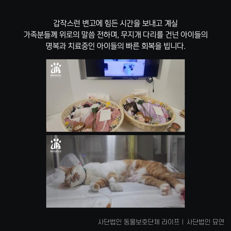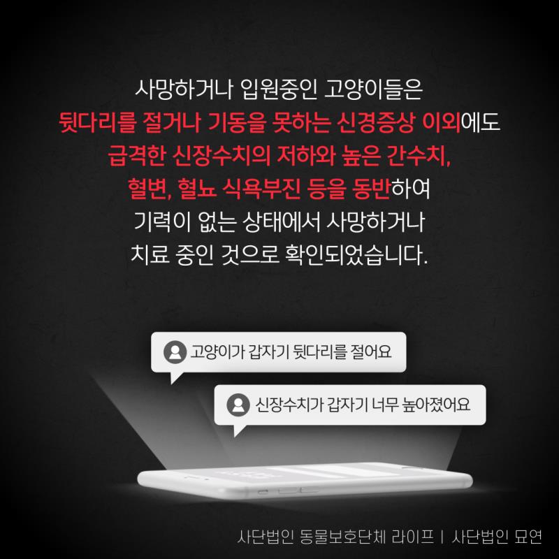 사단법인 동물보호단체 라이프와 사단법인 묘연을 비롯한 단체들은 증상 및 폐사 관련 제보를 받고있다고합니다. 혹시 비슷한 일을 겪으셨다면 소중한 제보 주시기 바랍니다.